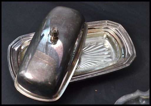 A collection of silver plated items to include a muffin warmer by a silver plated salver, butter dish, oblong tray, candle scissor snuffers and white metal horse. Widest measures 27 cm.