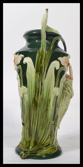 A 19th century Victorian Art Nouveau /  Secessionist movement Austrian / German vase having raised decoration of leaves and flowers with impressed number 4080 to base. The vase having a bisque figurine of a maiden with leaf handles. Measures 33 cm high.