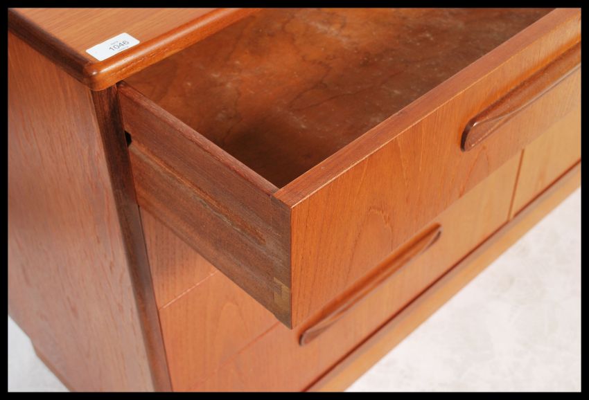 A 1970's G-Plan teak wood Kelso Pattern double chest of drawers being raised on an inset plinth with upright bank of drawers having recessed handles. Measures 76cm high x 142cm wide x 44cm deep.