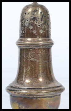 A group of silver items to include a hallmarked silver topped and cut glass tall sugar shaker sifter , a smaller salt condiment cut glass with silver rim and a silver hallmarked pepperette. Please see images.