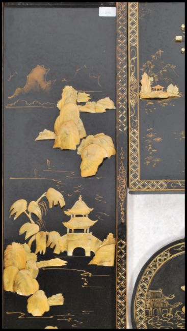 A collection of three Chinese lacquer and chinoserie shibiyama wall plaques decorated with mother of pearl showing Geisha girls etc one with an inset quartz clock movement.