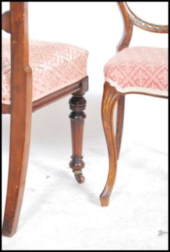 A harlequin set of Victorian dining chairs to include 2 kidney backs, 2 balloon backs and a further pair of balloon backs with green upholstery. matching upholstery to the 4 shown
