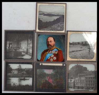 Three vintage wooden magic lantern slide cases full with vintage magic lantern slides, including Royalty , views , buildings etc. Please see images.