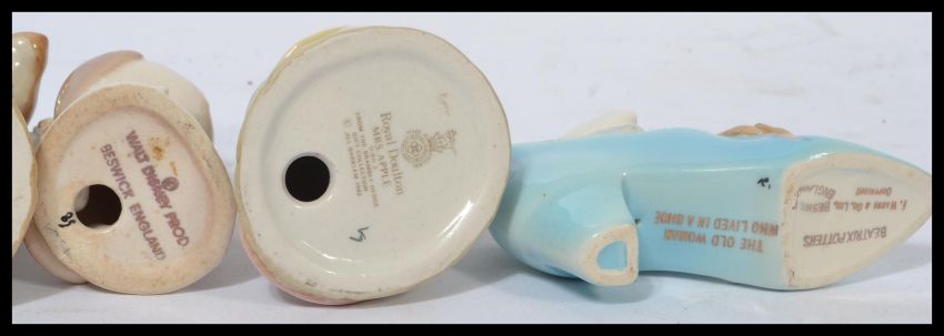 A group of Beswick / Royal Doulton ceramic figures to include Disney Beswick owl , Mr and Mrs Apple Bramley Hedge , Beatrix Potter Old Woman who Lived In A Shoe , and Hunca Munca Sweeping. All appear in good order. Tallest measures 9cms high.