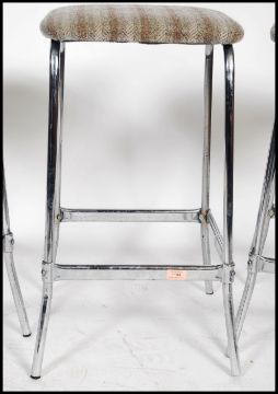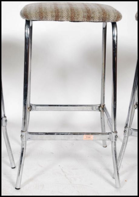 A set of 3 mid century chrome bar stools. Each with tubular chrome tall frames complete with the padded overstuffed believed original wool upholstery. Measures 68cm tall.