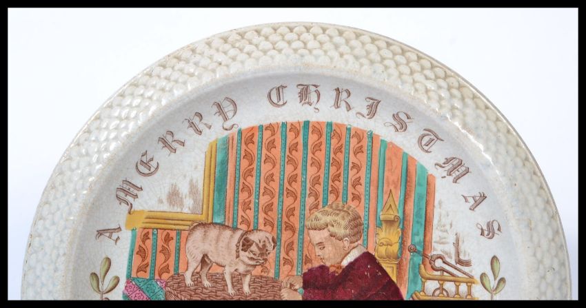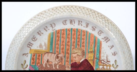 A 19th century Victorian ceramic dog bowl depicting a small dog sat on a wicker basket with boy in traditional dress. The plate reading A Merry Christmas & A Happy New Year. Measures 28 cm diameter.