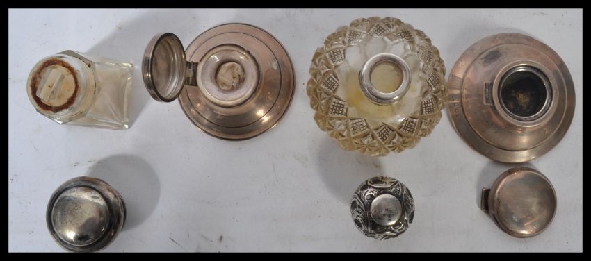 A collection of silver hallmarked items to include a silver topped cut glass perfume bottle, two capstan ink wells and a silver topped glass pot. Highest measures 11 cm.