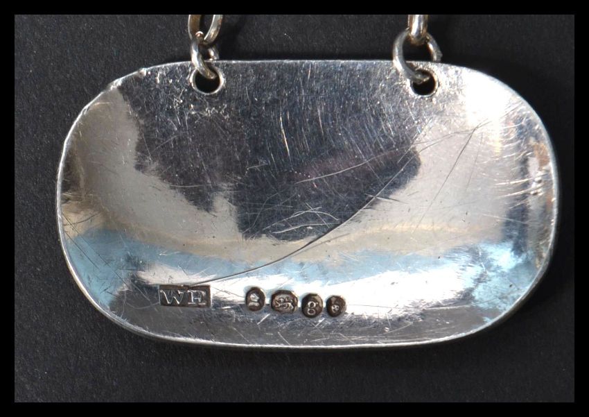 A 19th century Georgian silver hallmarked decanter label and chain engraved with whisky motif. London 1822 by William Eaton Weight 10.4 grams. Measures 4.5 cm wide and 13 cm high.