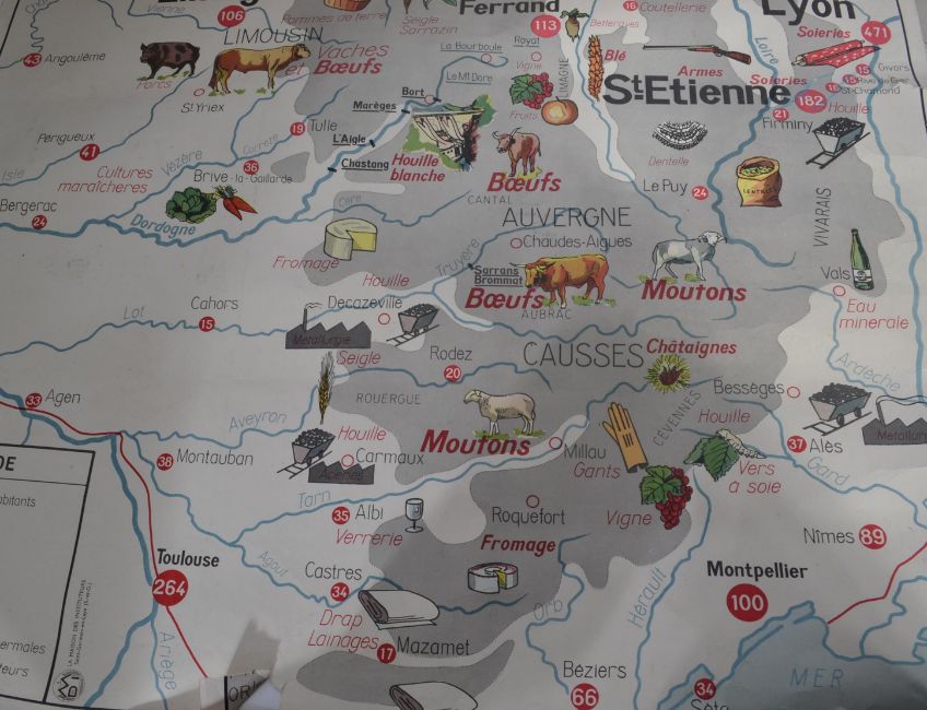 A vintage mid century French " Region Mediterraneenne et Corse Carte Economique " school poster together with another