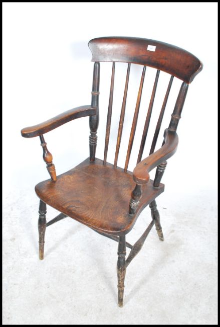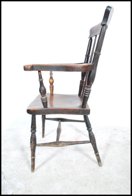 A Victorian beech and elm windsor armchair raised on turned legs united by stretchers, saddle seats with railed back rests. Measures: 102cm high x 65cm wide x 62cm deep.