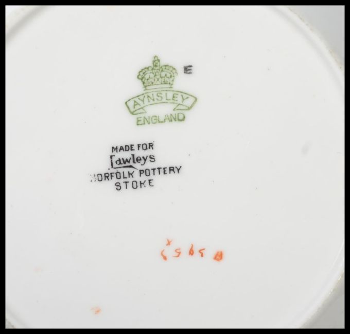 An early 20th century Aynsley bone china part service, to include  plates, cups, saucers, teapot , sugar bowl , creamer jug etc. each polychrome decorated with pagoda and flowers with outer geometric border, printed marks beneath.