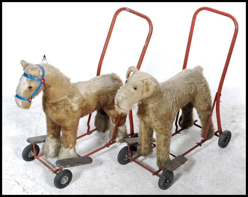 2 vintage early to mid 20th century Triang type childs push & ride along stuffed animals to include terrier dog and horse. Both on original frames with remains of paint and wheels