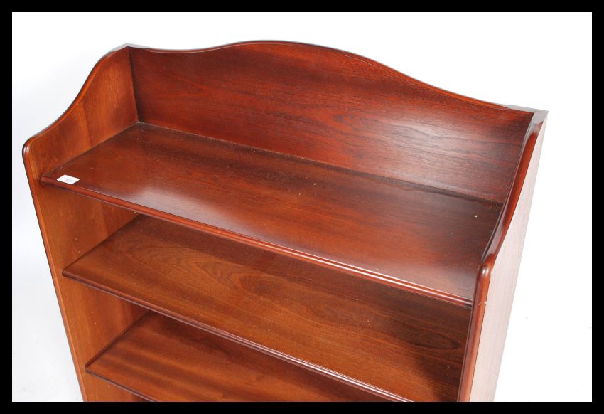 A good quality Parker Knoll 20th century open window bookcase cabinet raised on plinth base with a series of adjustable shelves having gallery surround. Parker Knoll label verso. Measures 111cm x 85cm x 34cm.