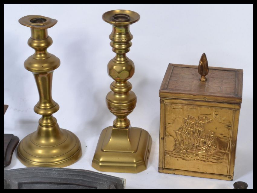 A collection of vintage and antique brass wares to include a Pot Office set of postage scales, 19th century  candle sticks, door furniture, tea caddy etc please refer to images. Highest measures 26 cm.