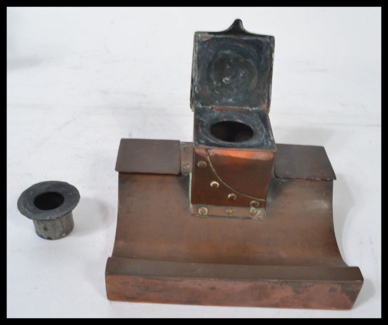 A 20th century Arts and Crafts hand beaten copper inkwell / desk tidy, central inkwell flanked by hinged compartments for stamps with a tray to the front for pens. Measures 8 cm high and 16 cm wide.