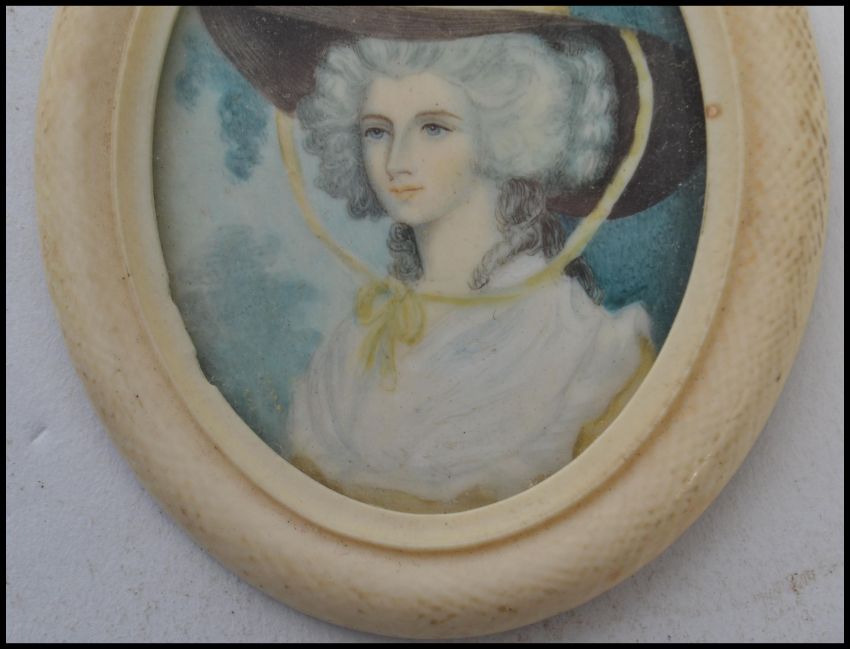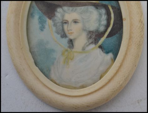 An 18th century portrait miniature painting on ivory of a lady in traditional dress and hat set to an ivory frame. Measures 7 cm high and 6 cm wide.