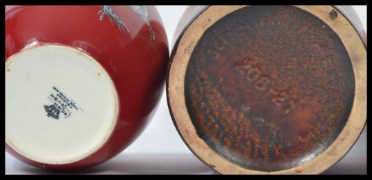A collection of vintage mid 20th century ceramics to include West German fat lava vases, water jugs, red ground with swans in flight. Highest measures 27.5 cm.
