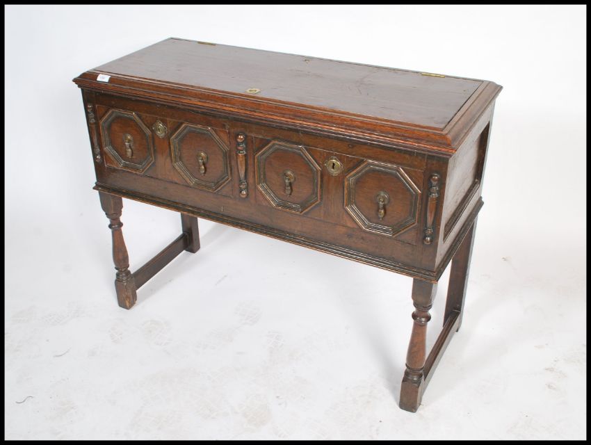 An 18th century oak Jacobean revival dresser base side cabinet being converted to a gramaphone cabinet. Raised on twist supports having an 18th century drawer front with the top being hinged later to house a gramaphone. Measures 82cm x 108cm x 47cm.