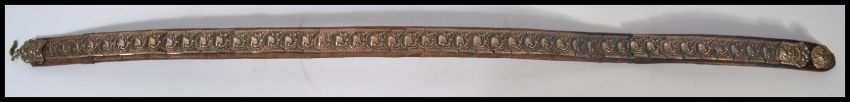 An unusual white metal and leather belt, believed early 20th century having unusual arabic design to each metal mount being threaded to the leather strap. Measures approx 90 cm length.