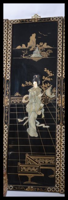 A collection of four lacquered shibayama wall panels, each with a Geisha girl in a different pose together with an oversized Chinese water carrier. Panels measure 91.5 cm high and the water carrier measures 47.5 cm high.