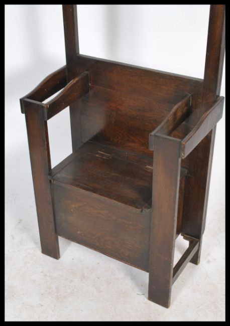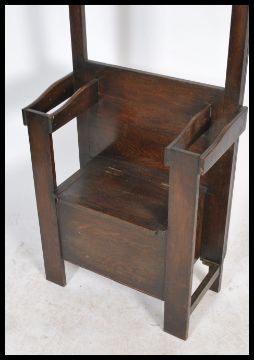 An early 20th century oak hall stand settle bench of upright form with mirror back having  four hooks above a hinged storage compartment. Measures: 178cm high x 64cm wide x 32cm deep.