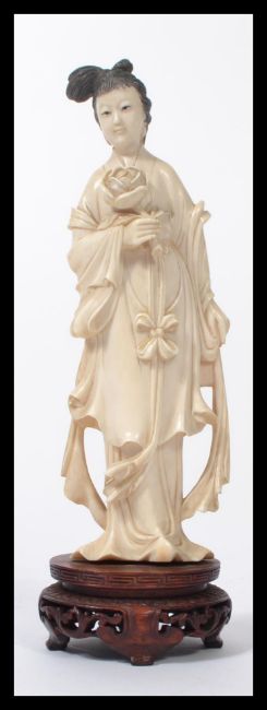A Japanese ivory Okimono of a bijin, Meiji period, the young woman carved standing holding a flower raised on a carved socle base. Measures 21.5 cm high.