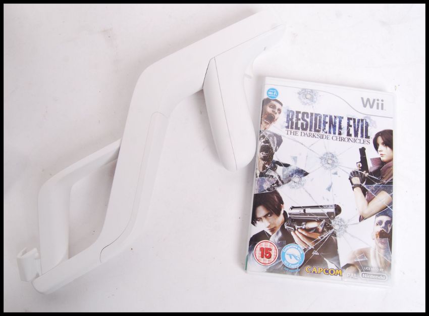 A Nintendo Wii games console, complete within the original box, along with a Resident Evil; The Darkside Chronicles Wii Zapper & game set.