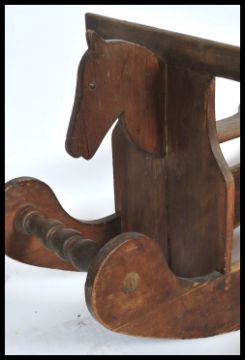 An early 20th century scratch built wooden naive rocking horse, the horse raised on gliders united by turned supports