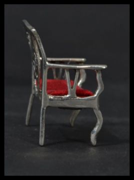 A sterling silver antique style miniature model of a lyre back sofa with red baize cushion. Weighs 15 grams.