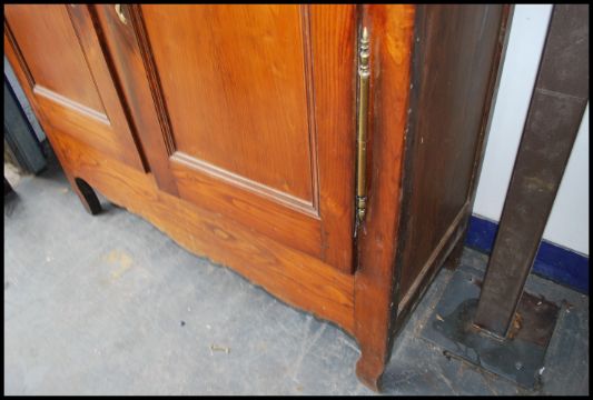 A 19th century French provincial chestnut armoire. The upright body with twin full length doors having brass hinges of polished form with matching serpentine brass key escutchons and shaped cornice atop, carved details to the uprights. fielded panel sides