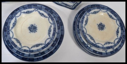 An early 20th century Sampson Hancock and Sons of Royal Corona ware extensive blue and white ceramic 12 person dinner service in the Alexandra pattern consisting of 5 graduating meat platters , 2 small tureens and stands , 2 large lidded tureens , 12 side plates , dinner plates and large dinner plates. Backstamps dating to 1912.