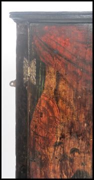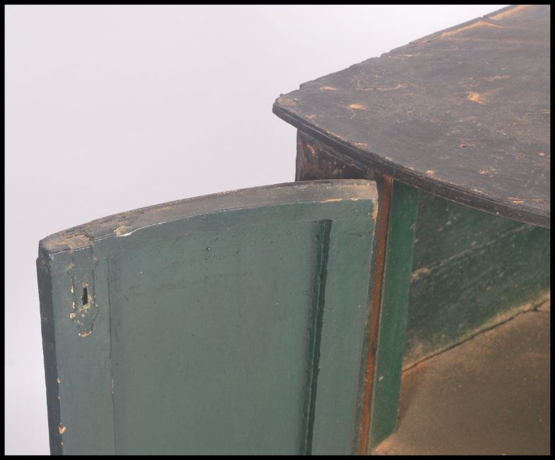 A 19th century chinoserie decorated corner cupboard. Ebonised lacquered finish with chinoserie details having full length doors with shelved interior. Measures 91cm x 59cm x 41cm.