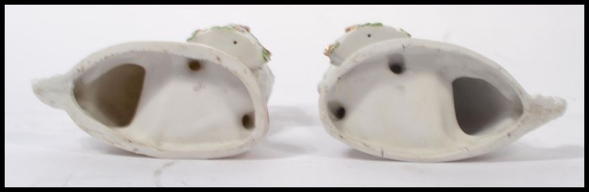 A pair of Staffordshire type porcelain figurines depicting Poodles ( dogs ). Each with white glaze being unmarked to the bases. Measures 16 cm high.