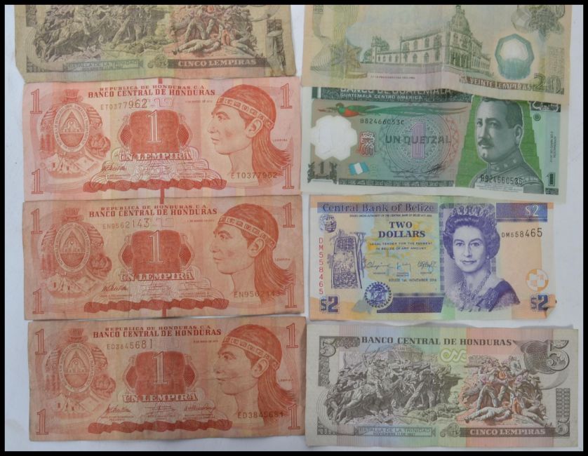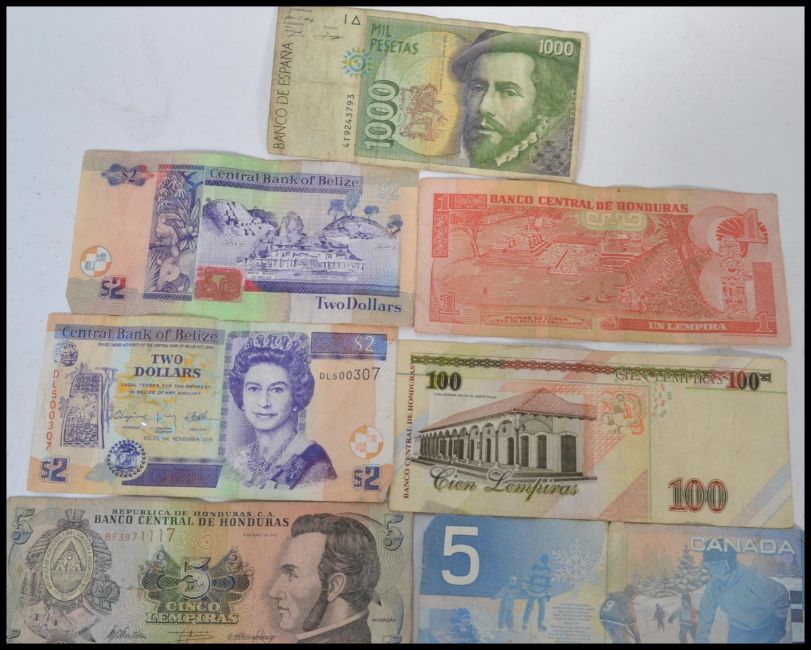A collection of bank notes to include Honduras 3 x 5 Cinco Lempiras notes, 4 x 1 Lempira Honduras Notes, 1 x 20 Veinte Lempiras Note,  Central Bank of Belize Two Dollar notes x 3, 100 Cien Limpiras Honduras Note, Un Quetzal note from Guatemala, 1000 Pesetas Spanish note, 5 Canadian dollar note,