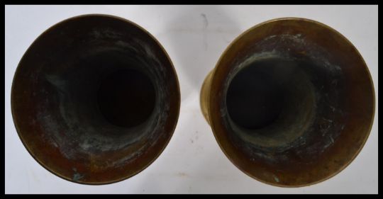 A large pair of heavy late 19th / early 20th century bronze vases raised on stepped circular bases with bulbous bodies having a gadrooned band with tapered flared rim. Impressed stamped numbers to base 10 No 50. Please see images. Measures 25.5 cm high.