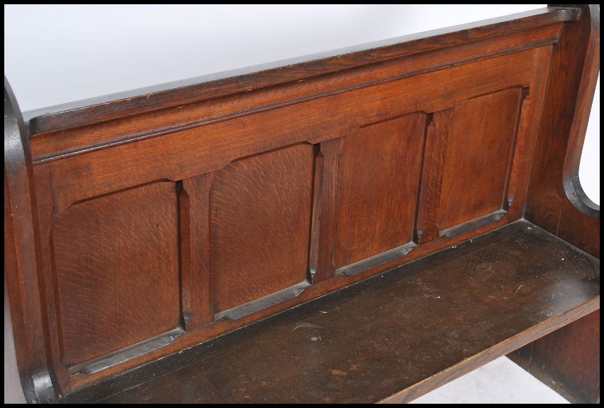 A 19th century solid oak eclesiastical church pew of shaped form being of small proportions. The planked seat with panelled back rest having shaped canted corner end elbow supports. Measures 101cm x 132cm x 37cm.