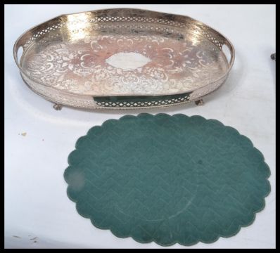 A Victorian silver plated twin desk top ink well desk tidy. The silver plated base on shaped feet with glass twin inkwells to centre. Together with a 20th century large silver plated salver with gallery edges. Measures 57 cm wide.