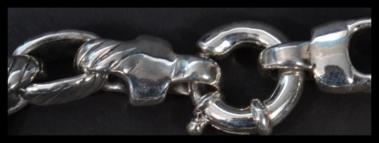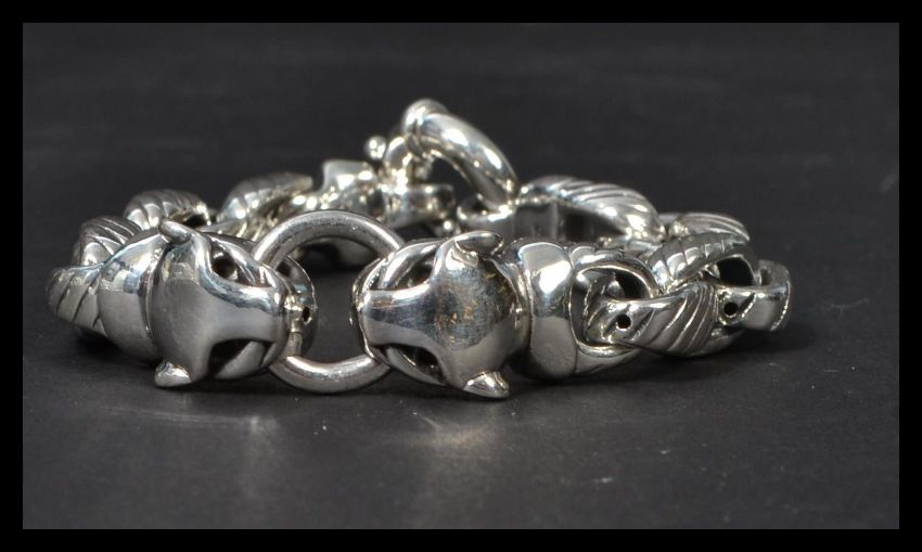 A sterling silver interlocking bracelet having panther links. Weighs 18 grams.