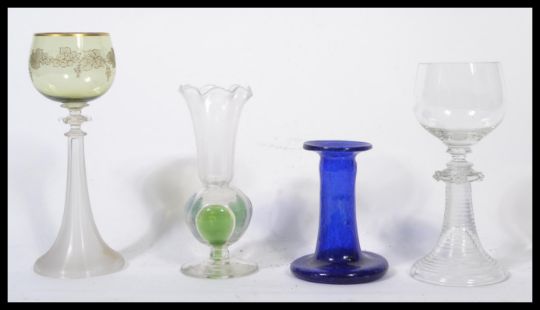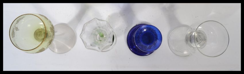 A group of 19th century glass to include a Victorian Alcase wine glass with ribbed stem and raspberry prunts to the knopped stem , a fine banded ribbed glass example with finial knopped stem and green glass bowl , a small vase with circular foot bulbous clear and green glass body and flared scalloped ring with engraved star decoration. Along with a 19th century blue glass vase on circular base with flared rim. Tallest measures 20 cm high.