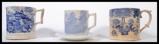 A group of three 19th century blue and white transfer printed tankards to include an Adams Oriental pattern tankard and saucer , one decorated with floral sprays and one with houses and fisherman of a bridge. Please see mages. Measures tallest 13 cm high. Condition report chip to first tankard and saucer , crack to both of the others.