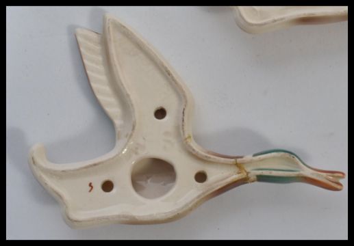 A set of three graduating vintage mid 20th century ceramic wall hanging Mallard Ducks, impressed marks to verso England. Measures 19 cm long.