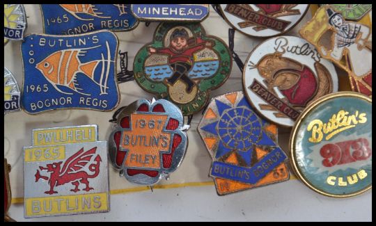 A collection of vintage enamel badges all pertaining to Butlins to include a rare 1957 Margate Holiday, chalet key badge, Skegness 54, Bogner 1962 x 2, Minehead 1963 x 2, Bognor Regis 1965 x 2, Pwllheli 1965 and 1954, Filey 1967, Butlins Beaver Club x 2, Bognor 1963, Butlins 913 club and a Butlins Travel By Stage Coach With Eric Winstone. Highest measures 3.5 cm.