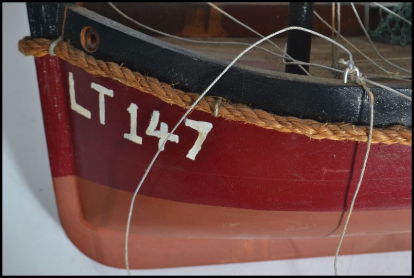 A vintage 20th century scratch built wooden model of a fishing trawler boat being hand painted with detailed features.