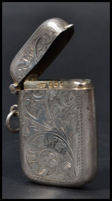A silver hallmarked match Vesta case having a fitted hinged lid, chase decorated with foliate design and central blank circular cartouche Birmingham assay marks with makers marks for Joseph Gloster Ltd and dating to 1913. Total Weight 30.5g. Measures 5.5 cm high.
