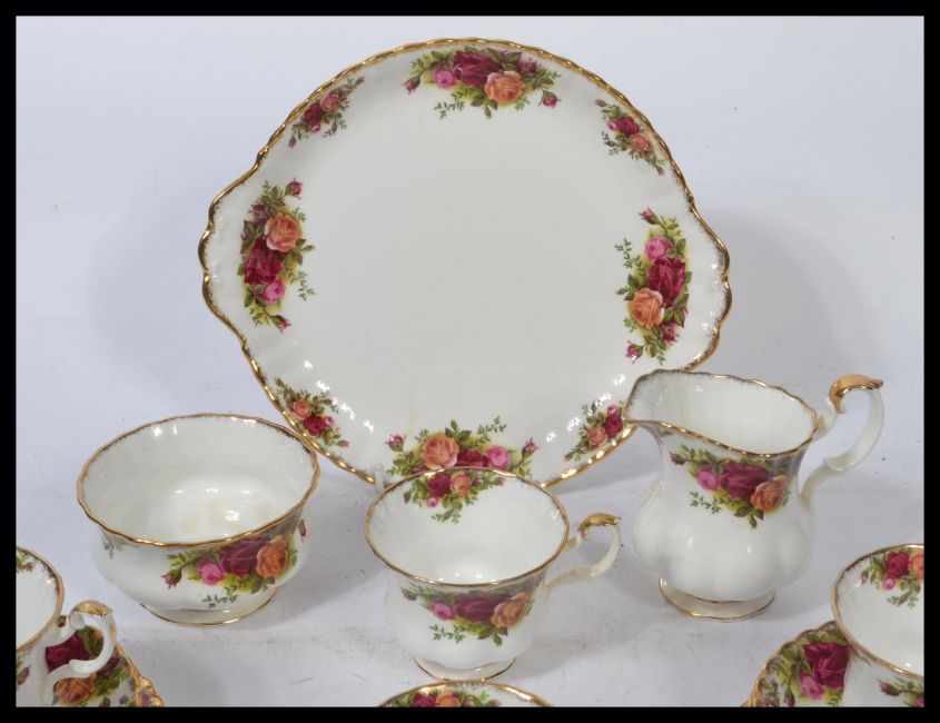 A mid 20th century bone China part tea service in The Country Roses pattern by Royal Albert consisting of trios, creamer, sugar bowl etc. All stamped to base. Plate measures 27 cm wide.