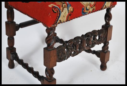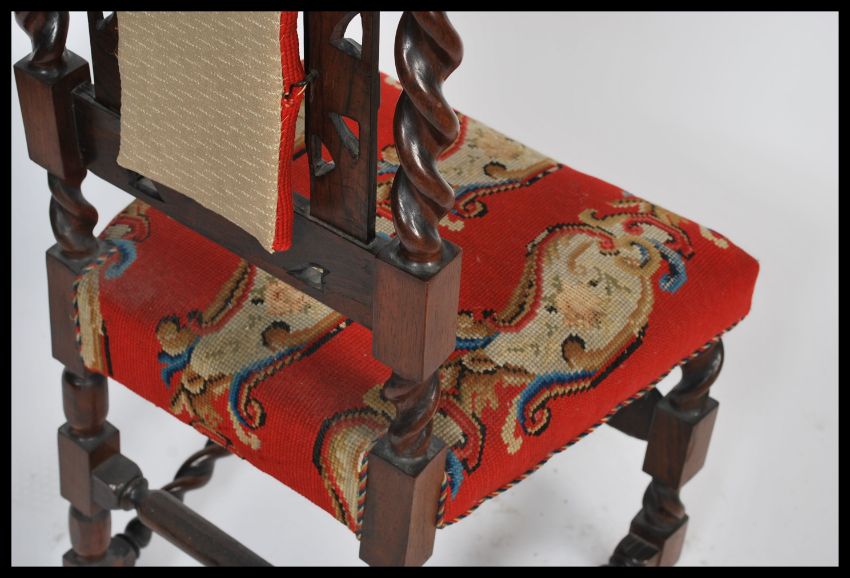 A good Victorian barley twist oak Carolean revival hall chair. The chair raised on barleytwist legs with stunning tapestry upholstered seat with barleytwist pilaster back rest. Measures: 120cm high x 45cm wide.