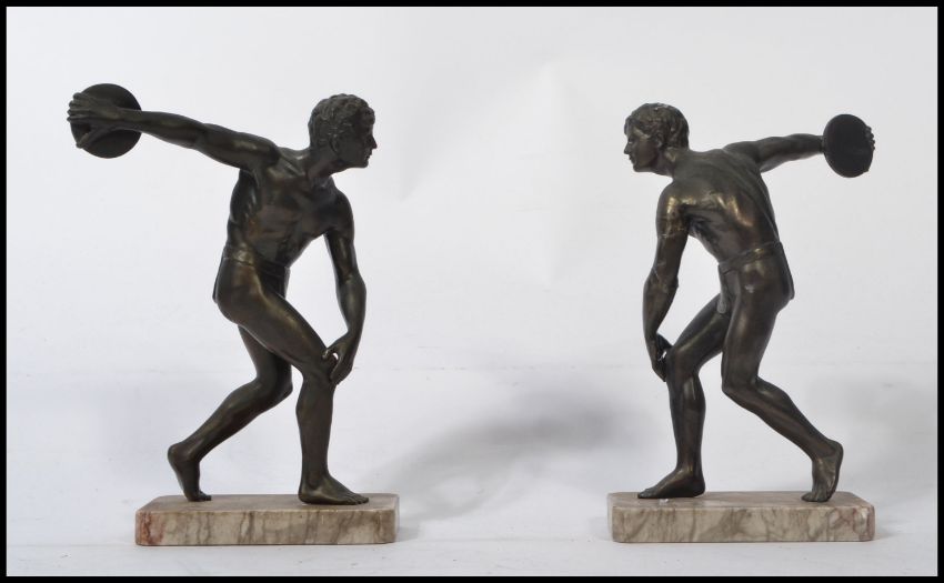 A pair of late 19th / early 20th century brown bronze cast figures of a classical discus throwers, each raised  on a marble plinth base