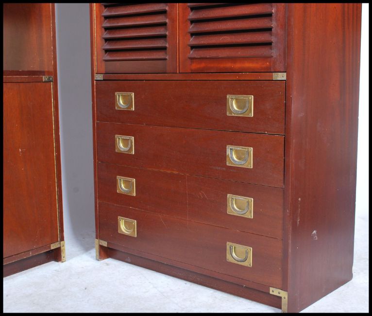 A pair of retro 1970's mahogany campaign style wall cabinets - combination units, each of upright form having inset brass campaign handles to the louvre cupboard doors and drawers etc. Measures: 180cm high x 80cm wide x 35cm deep.