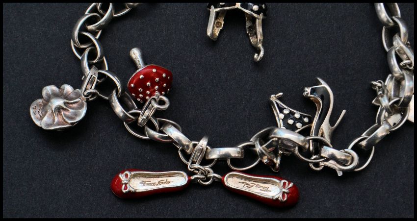 A 925 silver hallmarked Thomas Sabo Charm Club bracelet. To include Ballet Shoe, Flower, Toadstool Maple leaf, Bikini, Stiletto and Star charms. Measures 8.5 inches. Weight 33g.