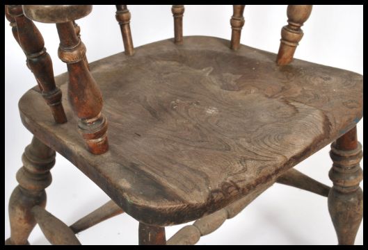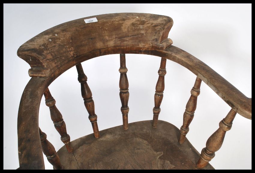 A Victorian beech and elm smokers bow - windsor armchair. Raised on turned legs united by stretchers having a saddle seat with gallery back rest. Measures: 77cm high x 62cm wide.